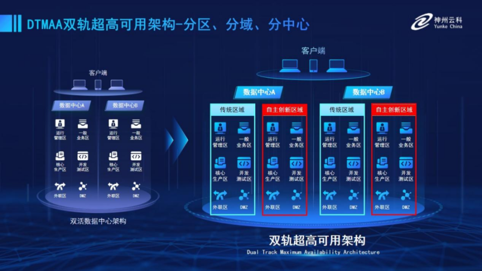 为帮助金融客户更好地应对数字经济时代对可持续性的高要求,实现“信创”与“数字化”齐头并进,开联通支付推出了双轨超高可用架构。该架构在双活数据中心的分区调度基础上,增加信创域和非信创域的分域调度,实行信创域与传统域应用全量部署,使双中心运营变为双中心四区域并行运行,互为多活,将“0到1”的单轨建设道路变为分区分域协同的多活双轨超高可用架构。帮助客户在新架构下,保障“信创”的同时解决性能瓶颈,提升稳定性,保证应用可持续性,最终实现信创区域和非信创区域的平滑过渡,完成国产化替代目标。